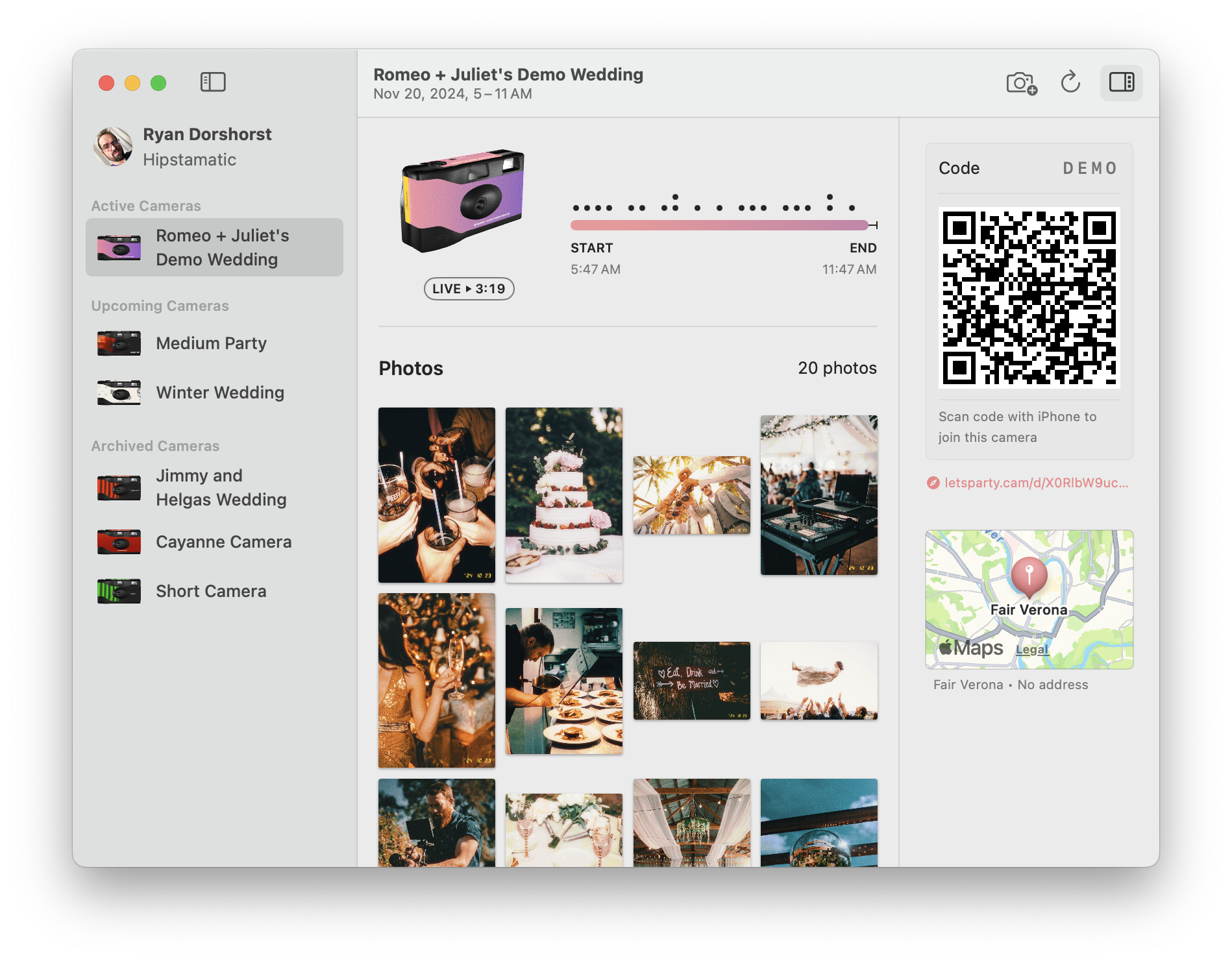 By simply scanning a QR code, event guests will instantly join a shared virtual disposable camera. The experience is magical and engaging, and the next morning everyone gets to see all the photos that were taken.